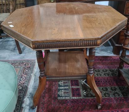 19th century mahogany octagonal centre table on turned and ring supports, square undertier, cabriole legs to castors