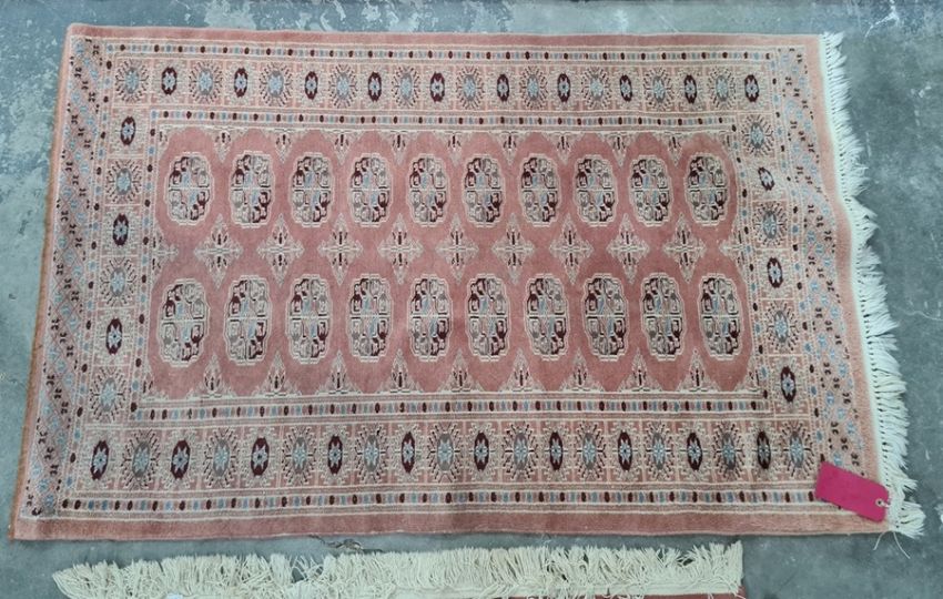 Persian style rug in pink , elephant guls in blue and red border; measurements 147cm x 95cm