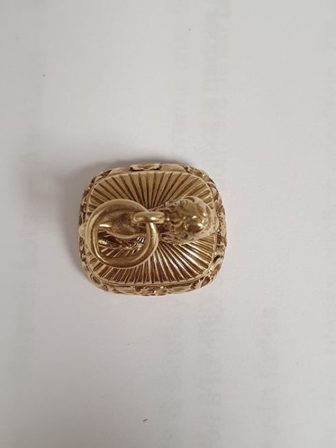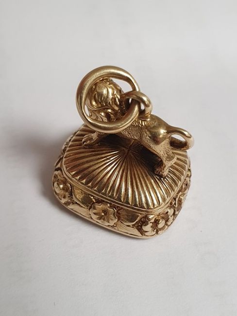 Small Georgian gold seal, rounded oblong, ribbed and floral, the mount in the form of a lion and inset intaglio carved cornelian, gross weight approx 8.2g Provenance: By descent, from the family of the Dukes of Hamilton, Scotland and the Ducs de Coigny, France, one of whom served under Napoleon. Condition ReportLion feels solid, but almost impossible to tell if hollow or not (strongly suspect solid). Some rubbing to the gold on the lion, where it has been handled over time. Various fine scratches to the stone.