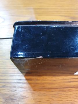 Russian rectangular lacquered box, black with winter scene to lid, signed indistinctly lower right and numbered 21 to middle, lid enclosing red interior, 13.5cm x 8.8cm Condition ReportNumerous light surface scratches, some small cracks to the painting, accretions,  some areas of loss to the lacquer.  General wear and tear commensurate with age and use.  See attached images