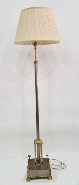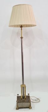 20th century standard lamp in brass and steel circular column square base with cream pleated shade