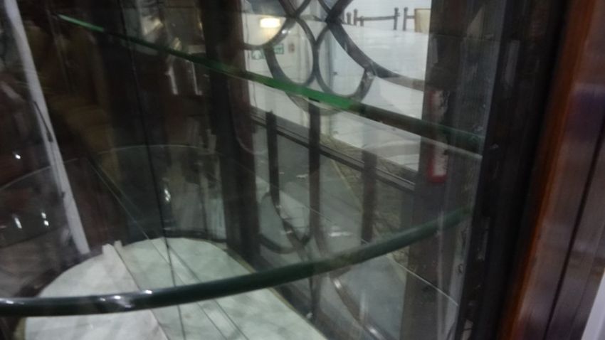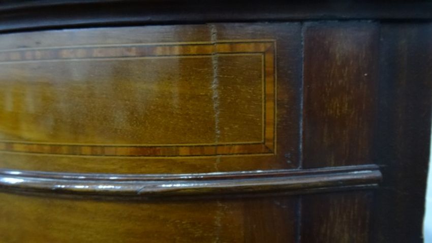 Late 19th/early 20th century mahogany display cabinet, satinwood strung, single astragal glazed doors enclosing glass shelves, the door flanked by convex glass to the sides, the whole raised on turned supports, 122cm x 183cm Condition ReportSome cracks / splits, some general wear and tear. Not sure if mirrored back original, or shelves. No apparent woodworm. Does not appear to have been cut down.