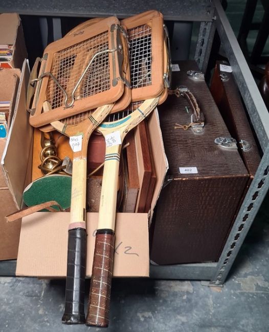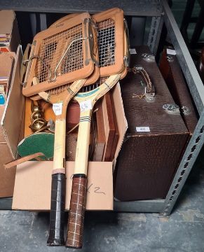 Assorted books, a camera and a cased Singer sewing machine and two vintage tennis rackets