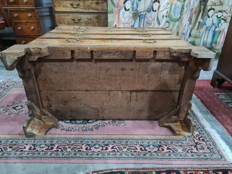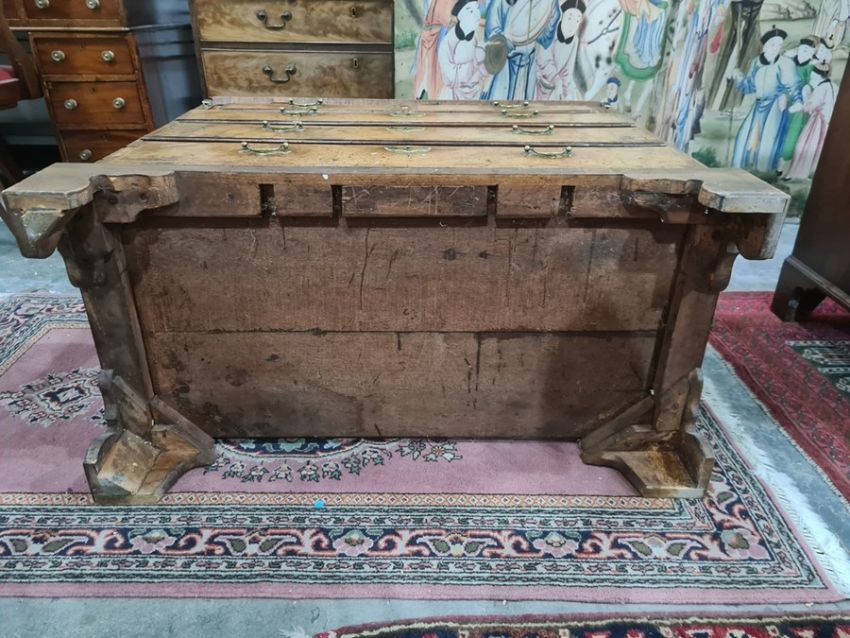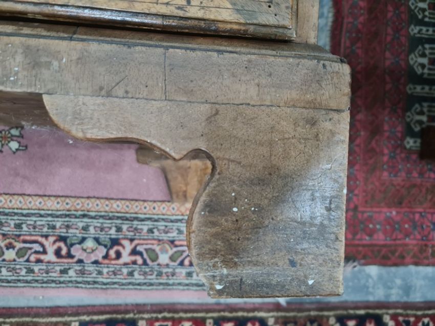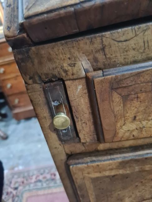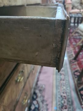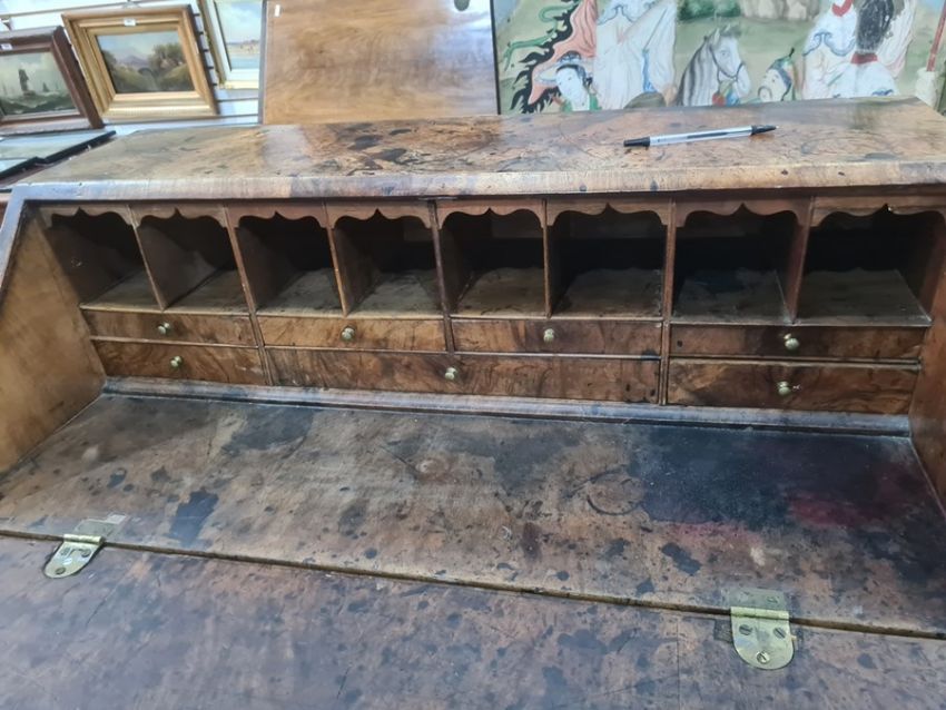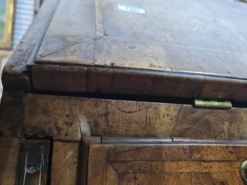 18th century mahogany and banded bureau, the fall with brass escutcheon, fitted interior above two short and three long graduated drawers, bracket feet, 91cm wide Condition ReportThere is a crack to the top. One of the boards is missing from the back. The top doesn't close all the way and is slightly warped. The top is also loose from one of the hinges and there is some damage to the inside. There is damage to the left of the top draw. Both sides have some wear near the front. The 2nd draw up  does not close all the way. The feet look new and possibly the entire base. There is no obvious sign of woodworm. The sides are painted in grained walnut effect.