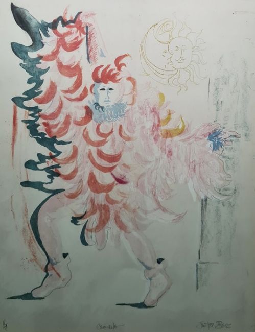Jeni Sharpstone (20th century) Limited edition print "Carnival", 1/7, signed lower right 'Jeni ? Bess', 49.5cm x 39cmGeldart (20th century)Limited edition print Study of a castle, 102/500, signed in pencil lower right, 34cm x 67cm Oleograph printStill life of flowers (3)