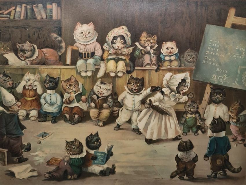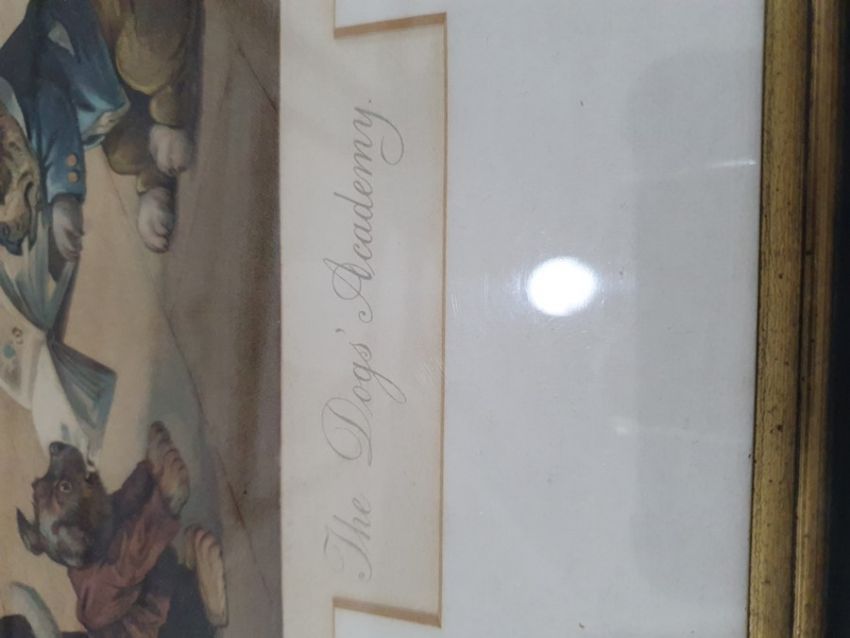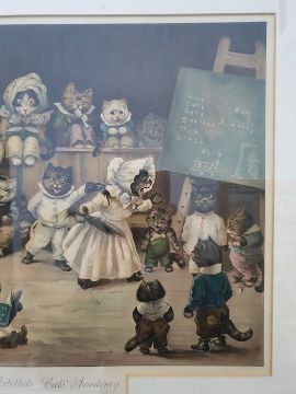 After Louis WainColour prints"Mrs Tabitha's Cats' Academy" and "The Dogs' Academy", 32.5cm x 42.5cm (2) Condition ReportAreas of fading and discolouration, yellowing to the edges, printed on paper, possibly early 20th century. General wear and tear. See photos