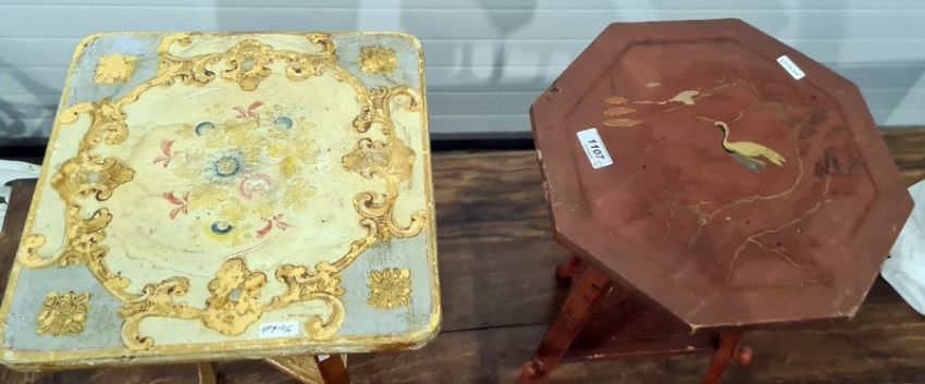 Square painted two-tier occasional table and another red lacquered occasional table (2) Condition Report split to the top, not very secure on the base