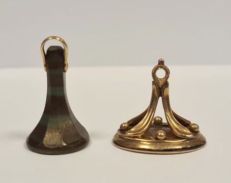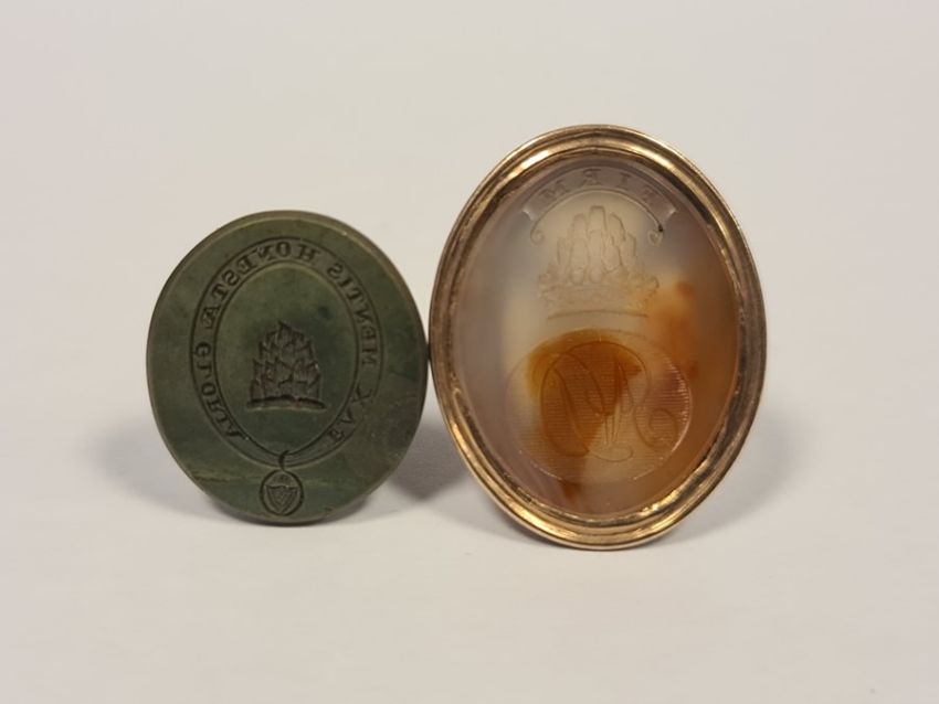 Georgian gold-coloured metal seal, oval and inset carved agate and a Georgian banded agate seal with gold hoop (chip to table) (2) Provenance: By descent, from the family of the Dukes of Hamilton, Scotland and the Ducs de Coigny, France, one of whom served under Napoleon. Condition ReportCarved agate seal measures 2.75 x 2 2.5 cms approxthe banded agate  2 x 1.75 x 3 cms approx