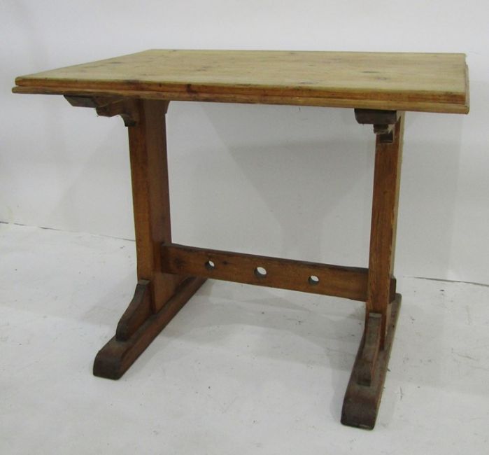 Early 20th century pine table, the rectangular top on trestle-style base, 88cm x 62cm