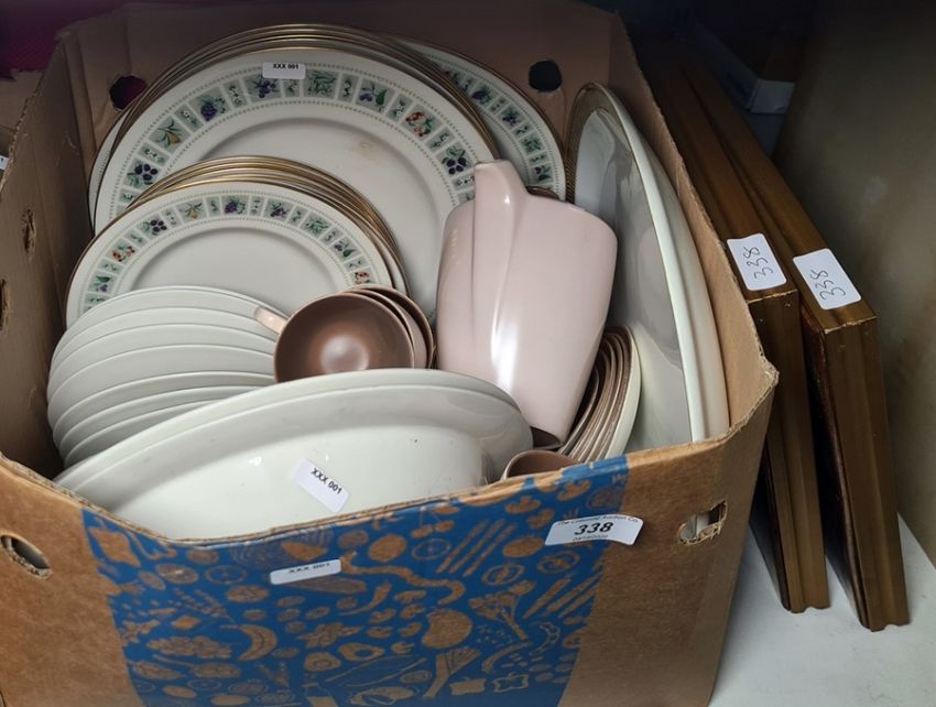 Royal Doulton 'Tapestry' part dinner service, a Poole part tea service, two vintage photographs and two framed model plaster of paris plaques showing Grecian figures