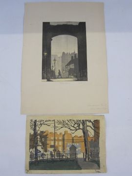 Collection of pictures circa 1920-1930 from Birmingham Municipal School of Art, provenance from the family of Ormond Edwin Gollins, assistant principal of Birmingham Municipal School of Art 1920-1930 G Harrison Woodblock print"Hill Street", signed, titled and dated in pencil 1924, 21.5cm x 15cm Beryl Antrobus Woodblock printBoy with shire horse, mounted with name in pencil and "Birmingham Central Municipal School of Arts & Crafts" label verso, 16cm x 15cm Beryl AntrobusWoodblock printWoman in cloak carrying chamber stick, signed in pencil verso, 37.5cm x 25cmUnattributedWoodblock printStreet scene, 15cm x 22cm, two mounted and all unframed (4) Condition ReportAll prints appear in good overall original condition; no visible tears or other defects