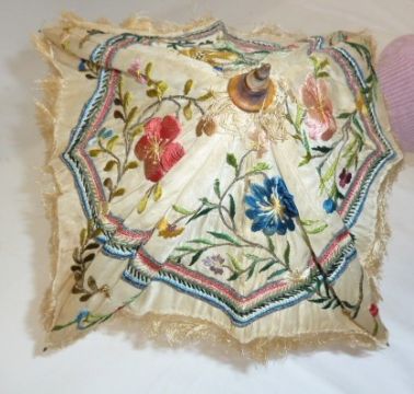 Miniature parasol with carved horn handle, embroidered silk (a little worn), the handle with gilt-coloured chain and small bead, the end decorated with coloured glass, possibly amethyst, peridot and turquoise Condition ReportApprox 37cm longThe parasol has areas of damage; some tears, stains and discolouration to the outer silk, loss of stitching to one bottom edge where the outer silk joins the lining and some tears to the lining at the centre around the handle (see additional images)