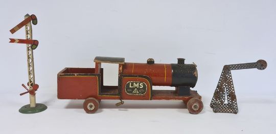Lines Brothers Ltd LMS wooden locomotive, a Hornby series track signal, etc (3)  the locomotive measures 40cms l. 14 cm h. and 11 cms w.Condition Reportthe locomotive measures 40cms l. 14 cm h. and 11 cms w.