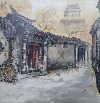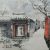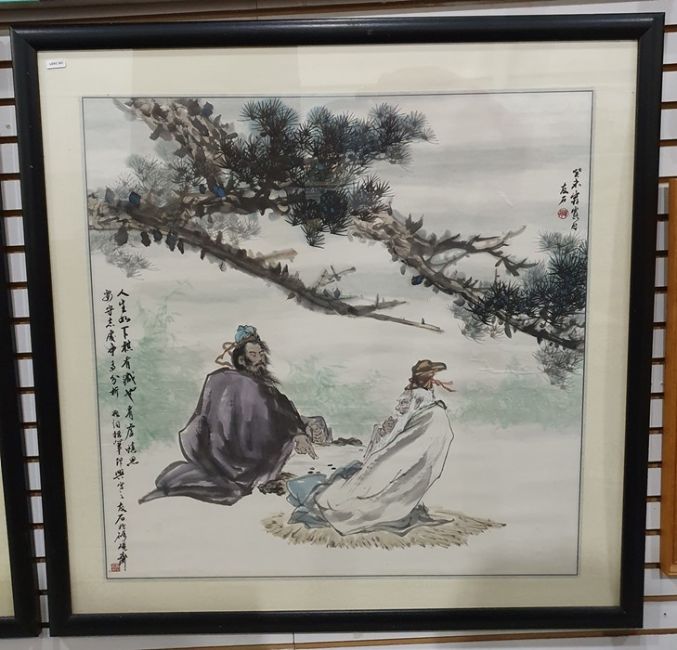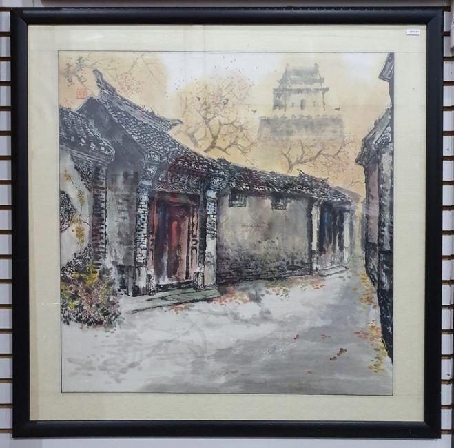 Three Chinese watercolours, one of two seated men playing a game of counters and two of ornate entrances, all with inscriptions and character seal marks and each 67cm square (3)