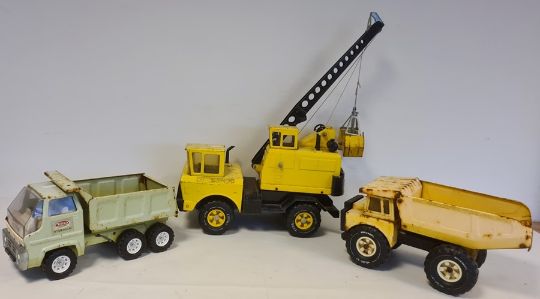 Three Tonka Matchbox large trucks and crane, together with leather case with further Tonka toys and an Elna sewing machine
