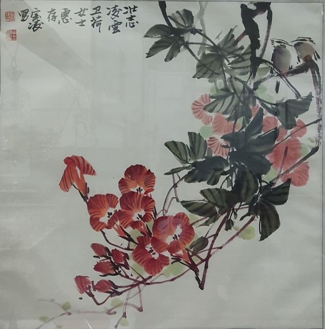 Two cartoon windowsPen and ink "Alex is restructuring Christmas", framed as one, each 14 x 10and aWatercolourWoodland river signed Lambert '87 ************** LAMBERT NOW WITHDRAWN************* ,  Chinese print of blossom with character mark and another print (4)