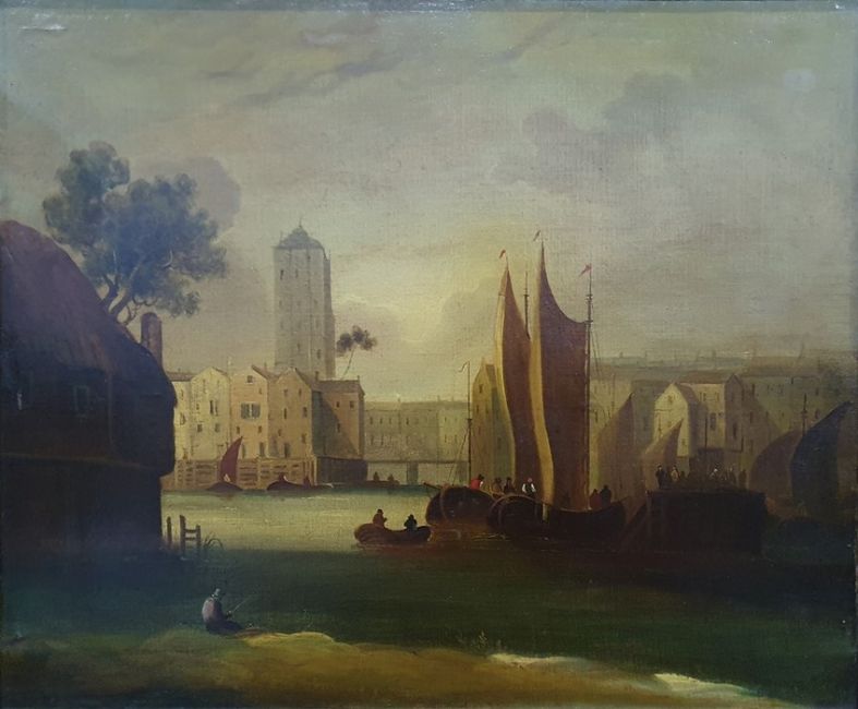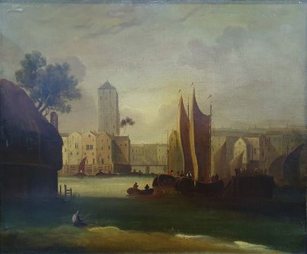 19th century Continental schoolOil on canvasSailing barges with buildings behind and a fisherman in the foreground, 49 x 59cm