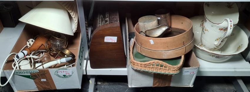 Ewer and basin, a vintage radio, assorted kitchen items and collectables and various table lamps (2 boxes +)