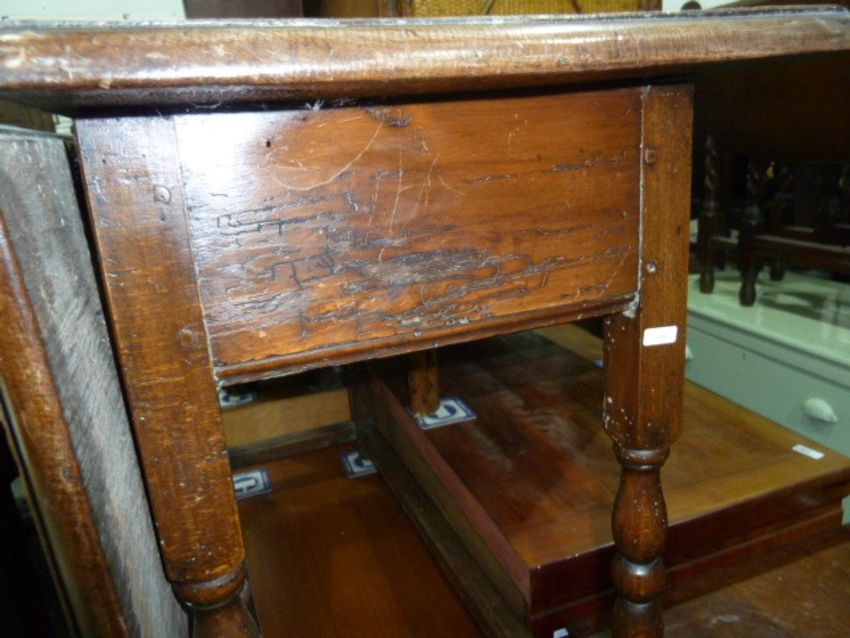 Probably 18th century oak drop-leaf gateleg table having single end drawer with brass handle, on baluster turned and block supports, stretchered base, single leafCondition Reportplease see imagesmeasurements 66 cms high, 34 depth, 65 cms wide