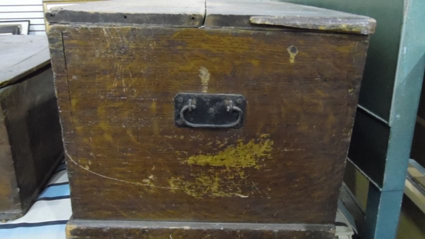 Wooden trunk, a wooden box and a leather case (3) Condition ReportThe largest trunk measures 90W x 49D x 43H cmThe leather case has one broken strap; the smaller wooden chest has various areas of bumps, scrapes and damage and woodworm in the back; the large chest has marks and damage commensurate with age and use. see additional photos.