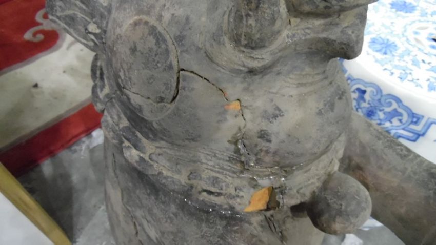 The boar has been repaired in the past and is quite fragile. There appears to be some loss on the underside. See additional photos.
