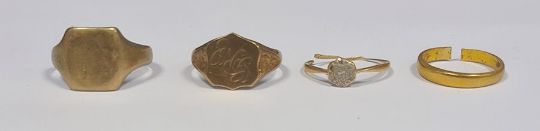 Two 9ct gold signet rings (8.9g) and a 22ct gold wedding band (cut 2.9g) and a yellow metal ring