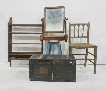Dark stained cabinet with two doors bearing the initials FMC and WW, opening to reveal assorted drawers and open shelf together with a chair, dressing table mirror, stool and wall hanging shelf (5)
