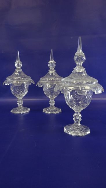 Set of three 19th century cut glass sweetmeat jars with covers, pointed finials , waisted stem on octagonal-shaped base, 30cm high