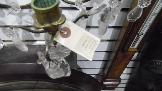 Pair of three-branch electric wall lights with glass drop decoration and brass body (2) Condition ReportDimensions: 54H x 30W x 17D cm.There are several drops missing - some are loose in a bag. Several arms are out of shape.See photo's.