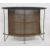 20th century bowfront bar with plain black top, with grill front, three shelves and brass tubular foot rest