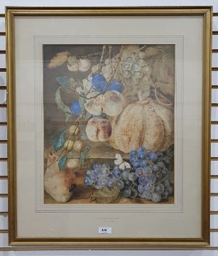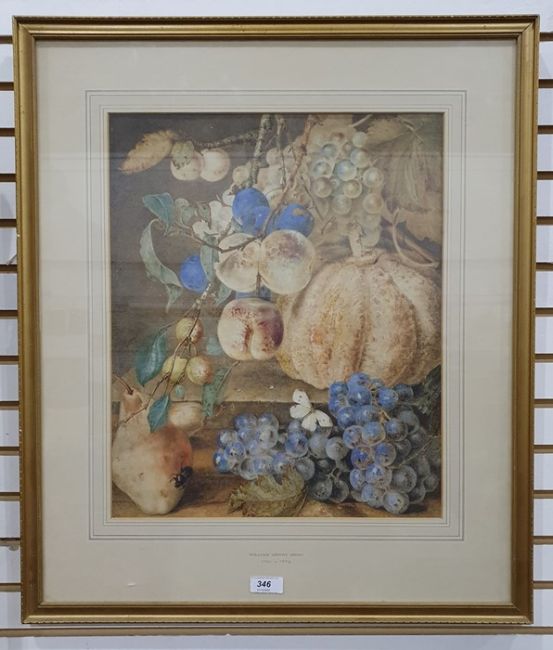 Attributed to William Henry Hunt (1790-1864)Watercolour Still life of a gourd, grapes, plums and apples, 43cm x 35cm