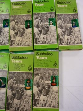 Subbuteo with fabric pitch, large quantity of teams, boxed, diving goalkeepers with caps, boxed, European competition cup, boxed, miniature throw-in figures, etc