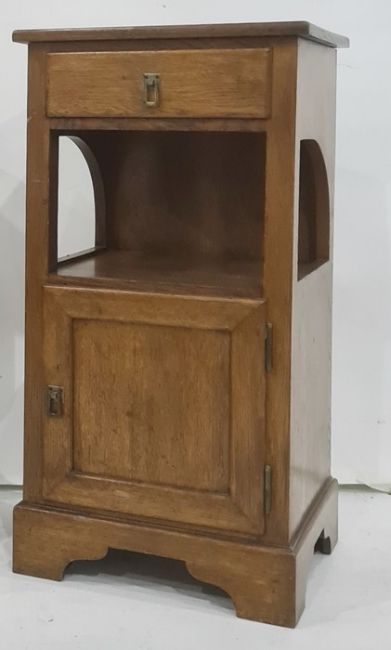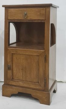 20th century single drawer side table in the Arts & Crafts manner, the rectangular top above single drawer, open undertier above cupboard door, on bracket feet, 39 x 42 x 75.5cm