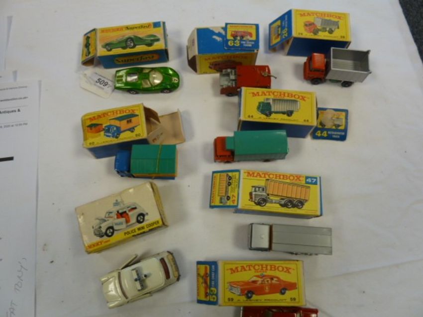 Collection of Matchbox series diecast models to include No.44 refrigerator truck, No.63 fire crash tender, etc and Dinky Toys 250 police Mini Cooper (8) Condition Reportplease see more images