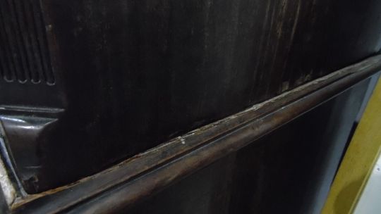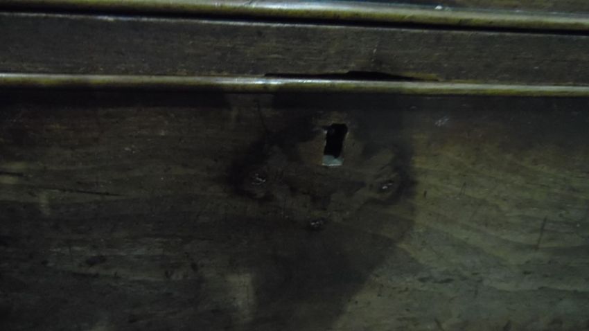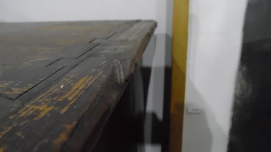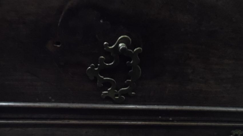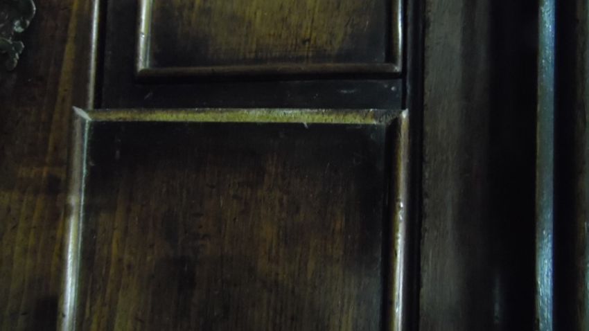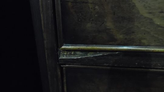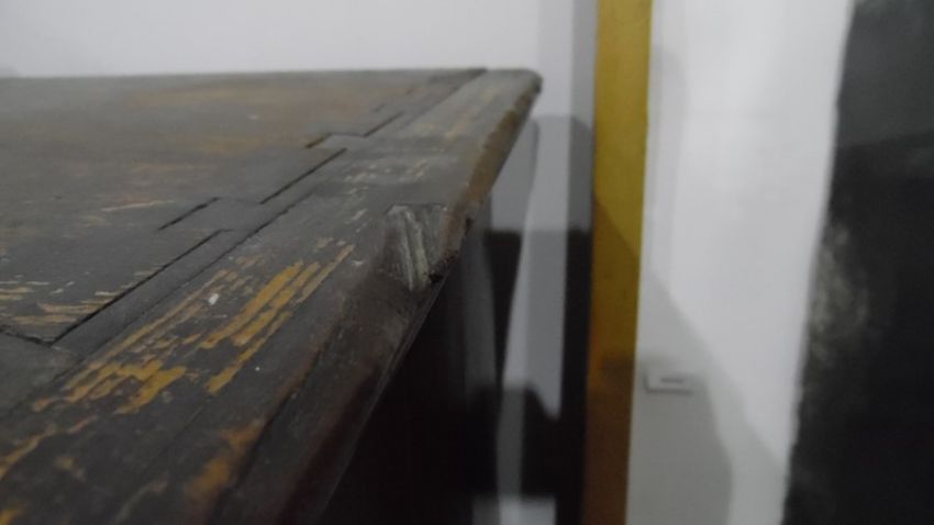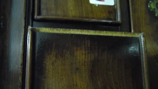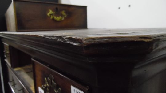 George III mahogany tallboy chest on chest, the top section with cavetto frieze, three short and three long graduated drawers flanked by fluted canted forecorners, the base with three long drawers, all with brass drop handles and pierced shaped backplates, cockbead borders, bracket feet cut down, 109cm wide Condition ReportDimensions of top section: 83h x 56d x 110w, bottom section: 76 x 54 x 107. The two parts separate easily for transport.There is general damage overall but structurally sound; there is a key but it is stuck in one of the locks; 3 drop handles are missing; 2 escutcheons are missing; 12 pieces of short beading are missing from the drawers. Some of theses saved in one of the drawers.The back appears to be original - on piece missing - and the drawer linings are as per attached photo's. There is no obvious or visible wormPlease see photo's.