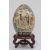 Japanese ceramic egg-pattern centrepiece, ovoid and decorated with panels of figures on a brocade ground, 28cm high and the hardwood stand