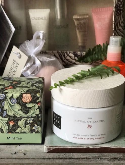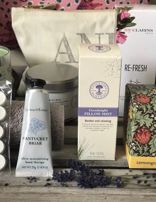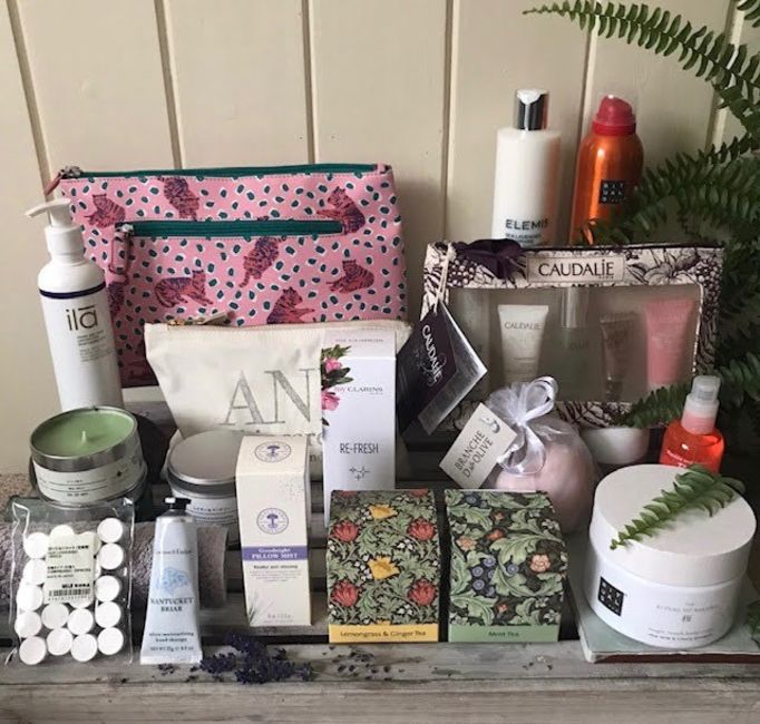 Kindly donated by Prep 8ELEMIS Sea lavender & Samphire Bath/Shower Milk, RITUALS Magic Touch Body Cream Rice Milk & Cherry Blossom, CAUDALIE Visage Essentials (6-piece set), MUJI Sea Salt Candle, MUJI Cinnamon & Mandarin Candle, NEAL'S YARD Goodnight Pillow Mist, BUMBLE & BUMBLE Hairdresser's Invisible Oil, CRABTREE & EVELYN Nantucket Briar Hand Therapy, CLARINS Re-Fresh Hydrating Beauty Mist, WILLIAM MORRIS Mint Tea, Lemon & Ginger Tea, JL Pink Tiger Washbag