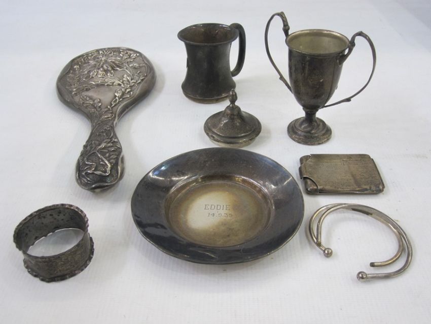 A 1930s silver two-handled miniature trophy cup, engraved '27th BPKC Dog Show, Presented by TRW to Sonny Boy Best Male Cairn', Birmingham 1932, 9.9cm high 1.5toz, an early 20th century silver christening mug, Birmingham, 1918, 1.56toz, silver card case, 0.7toz, a napkin ring, a dish (unmarked) inscribed 'Eddie 14.9.39' a silver backed dressing mirror, two silver coloured bangles and a silver lid (9)
