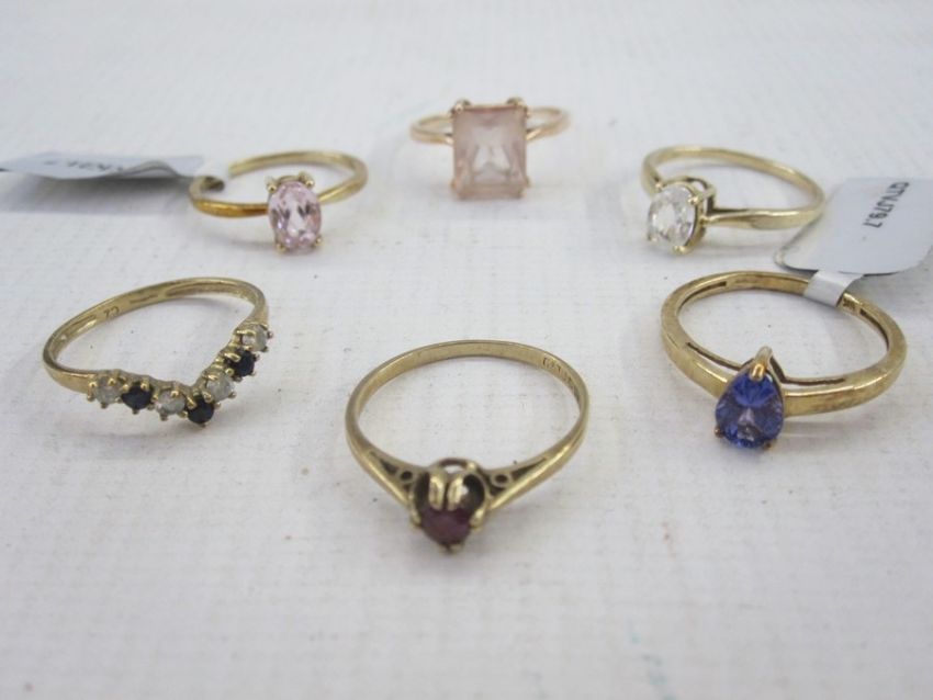 Six 9ct gold stone set dress rings (6)
