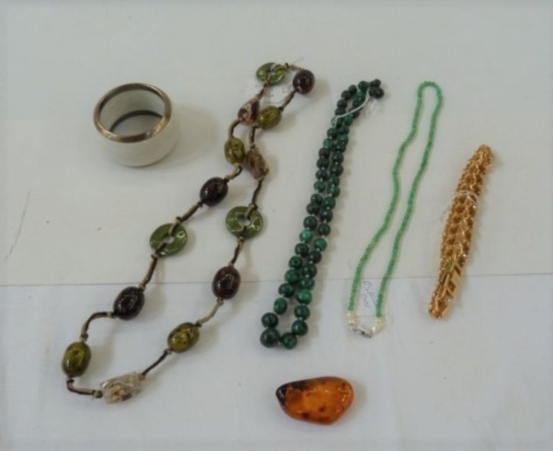 Mawi diamante and gilt chain collarette necklace marked to clasp, a 1970's beaded necklace in green and brown, a malachite beaded necklace, a Bally bangle, a jade-coloured and baroque cultured pearl necklace and an amber resin pendant (no chain) and an Alexandra Abraham brooch in gilt, turquoise and green, in original box, with relief decoration to lid, labelled to base of box