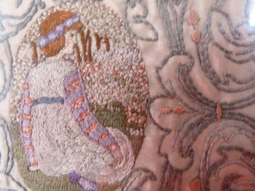 An early 20th century embroidered panel in Pre-Raphaelite style, rectangular with oval cartouche depicting maiden amongst garden, flanked by two smaller oval cartouches of seated maidens on a leaf and foliate scroll ground, 12.4cm x 25cm