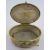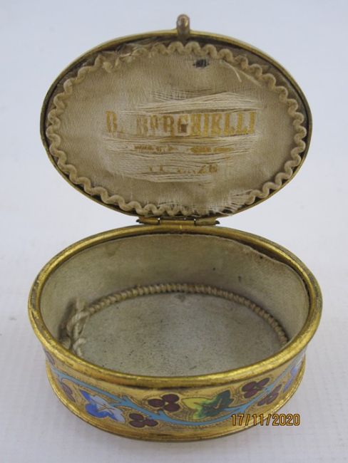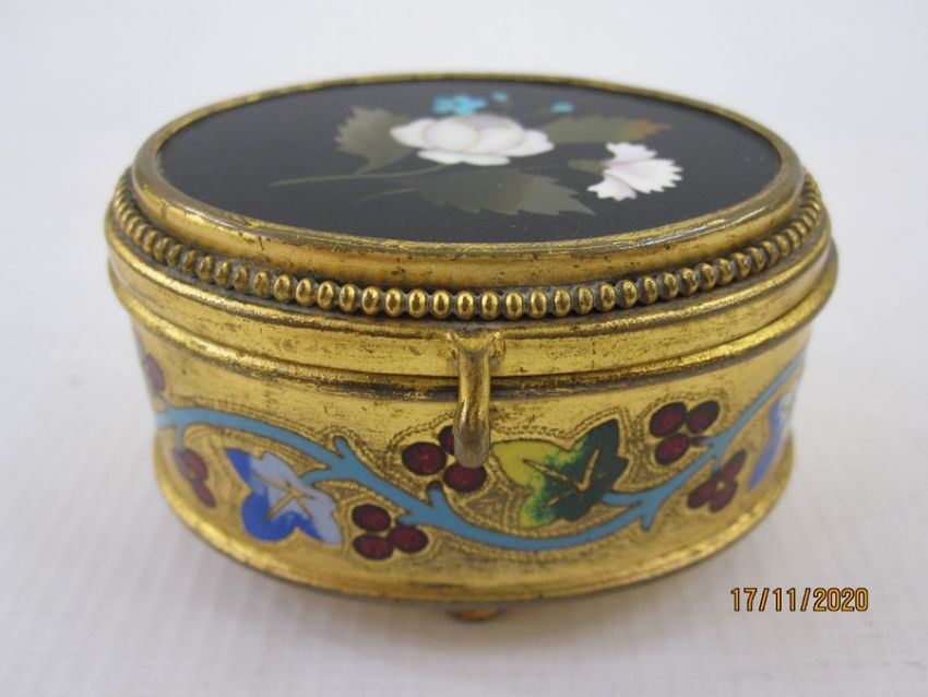 Late 19th century Italian gilt metal jewellery box of oval form, the hinged cover inset with a pietra dura panel of flowers and sides with enamel border of fluting vine on four feet and the interior fabric lining bearing remnants of the name Borghielli, Florence, 6cm wide