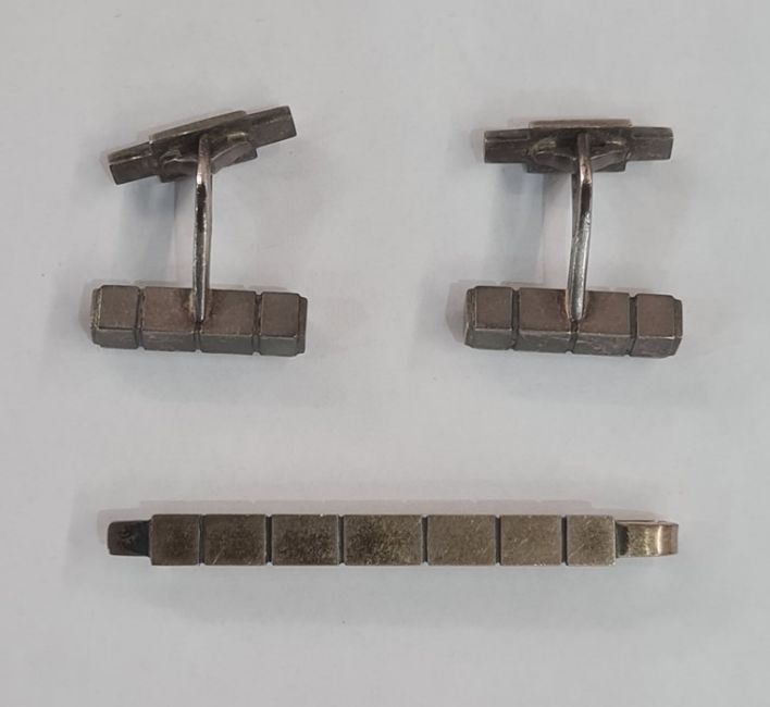 Pair of Georg Jensen silver cufflinks, design no.64, of block design with matching tie clip, in original box