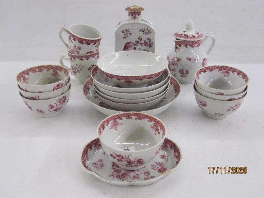 Late 18th century Chinese export porcelain part tea service with pink scale borders and floral spray decoration, viz:- seven tea bowls, four saucers, one shallow dish, small quatrefoil dish, small footed bowl, two teacups, lidded milk jug and a tea canister, collectors paper sticker verso for the Birchall Collection, formerly at Bowden Hall, Upton St Leonards