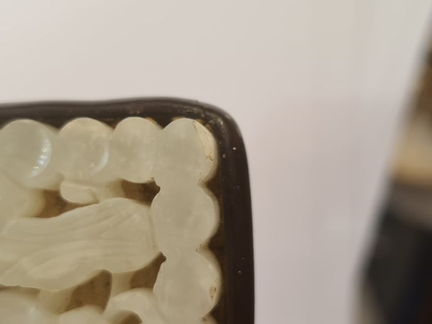 Chinese pale celadon carved jade openwork plaque, Ming dynasty, rectangular and carved with a wild swan amongst lotus blossoms, all within stylised concave pearl border and the foliate carved hardwood mount, 6.75cm x 5.25cm overall Condition ReportMount cracked as shownMinor cracks/ fractures in the jade