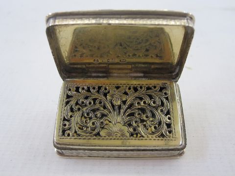 Victorian silver vinaigrette by Nathaniel Mills, rectangular and engine-turned with floral and foliate pierced grille Condition ReportHinges are good. The lid is engraved with initials. There are no bad dents or scratches.
