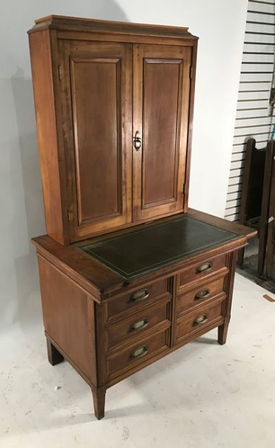 20th century oak desk / dressing cabinet, leather writing surface revealing inkwells, the upper section opening to reveal shelves, 100 cm wide