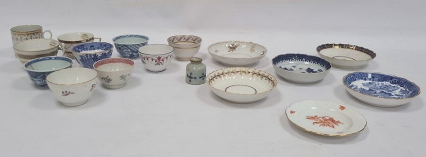 Eight various early English porcelain tea bowls and cups, five various saucers,  Continental small plate, two Oriental porcelain tea bowls and an early stoneware miniature drug jar