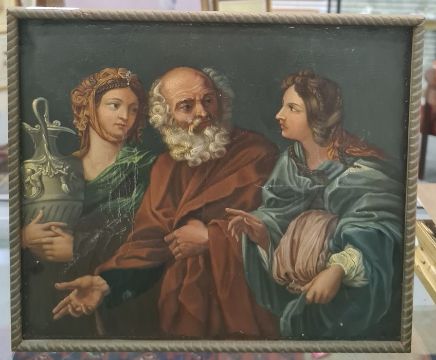 Continental schoolOil on boardElderly man with two maidens, one holding urn, unsigned, inscribed indistinctly verso 'Lot and his two daughters'(?), 23.5 x 28cm