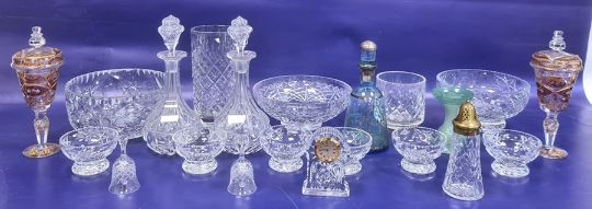 Various cut glass bowls, sundae dishes, vase, decanters and coloured glass items